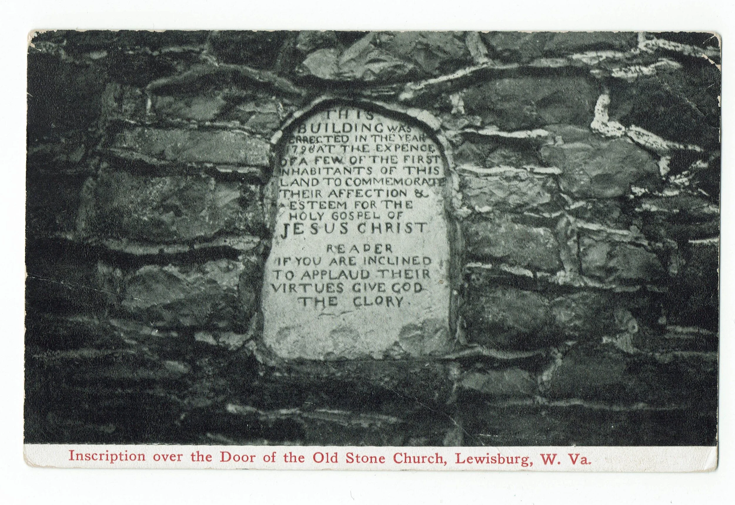 The devoted spirit of those who nearly two centuries ago erected this enduring place of worship in a wilderness is reflected in the inscription made by Col. John Stuart, who personally polished and carved the stone placed above the door: